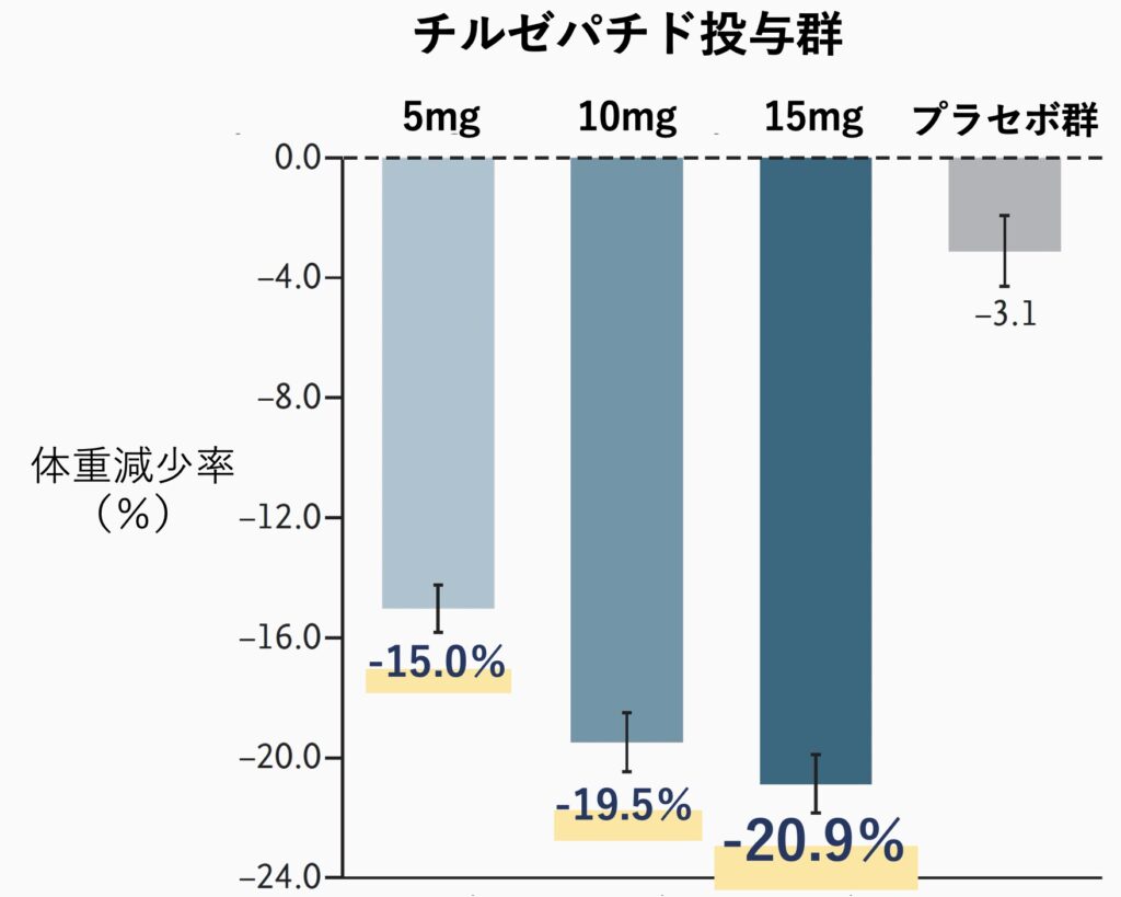 15mgチルゼパチド週1回投与群においては72週間で-20.9%(中央値)の体重減少効果を得ることができた、