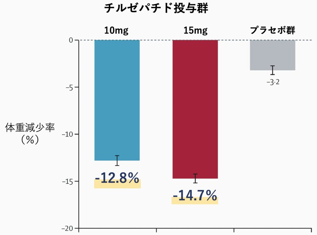 15mgチルゼパチド週1回投与群においては72週間で-14.7%(中央値)の体重減少効果を得ることができた、