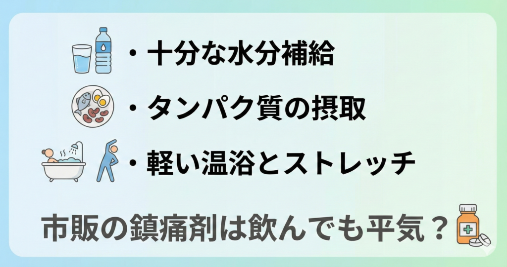 マンジャロ投与後の筋肉痛を少しでも和らげるための方法をご紹介します。ただし、これらはあくまで「一般的な筋肉痛」への対処方法です。症状が改善しない場合や悪化する場合は、速やかに医療機関を受診しましょう。