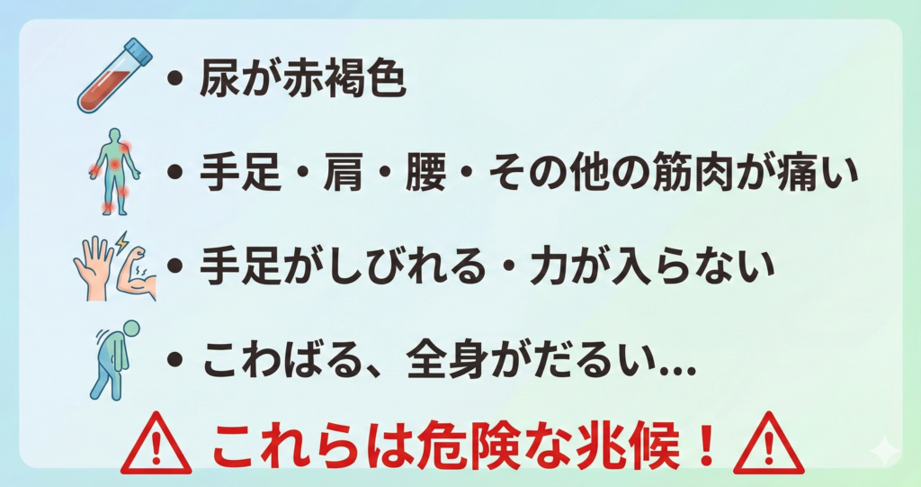 以下のような症状が現れた場合は、横紋筋融解症といったの『別の疾患』の可能性が考えられるため、直ちに医療機関を受診してください。