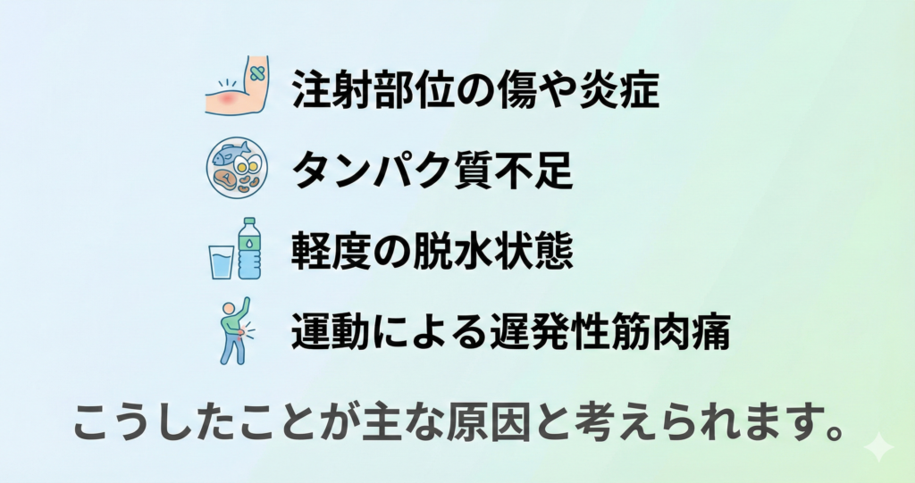 マンジャロを打った部位の皮膚や皮下組織が傷つくと、軽度の炎症反応が起こることがあります。そのときの痛みが、筋肉痛のような違和感として現れているのかもしれません。