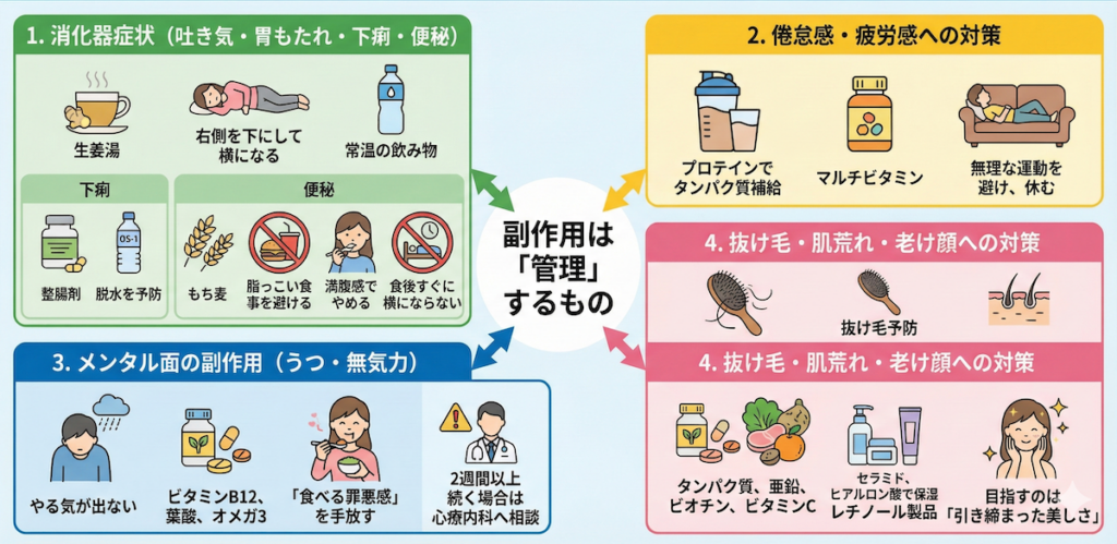 副作用は「我慢」するものではなく「管理」するものです。症状ごとに適切な対処法を知っておくことが、QOL(生活の質)を維持しながら継続するポイントになります。具体的な緩和策を交えて解説します。