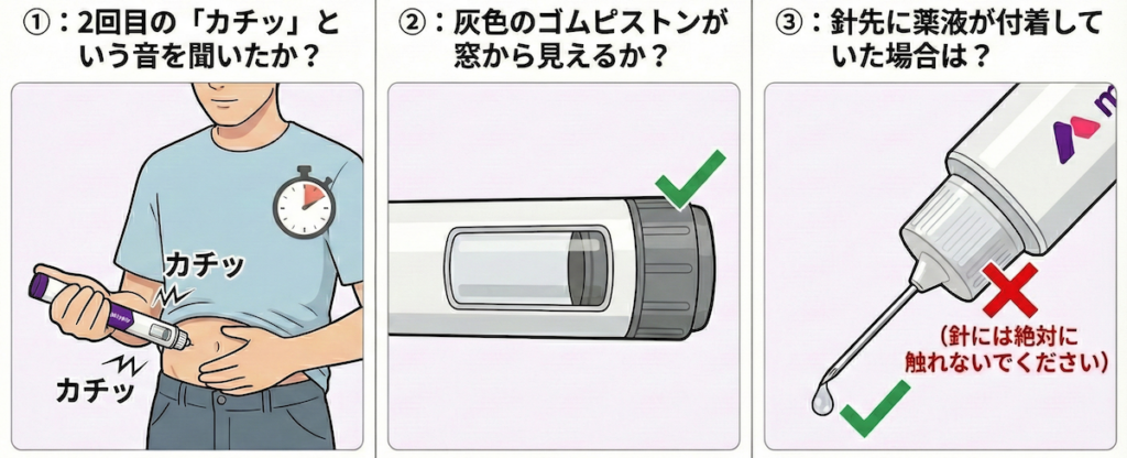 注射直後に「本当に薬が入ったのか」と不安になることは珍しくありません。以下の3つの確認ポイントをチェックすれば、失敗かどうかを判断できます。