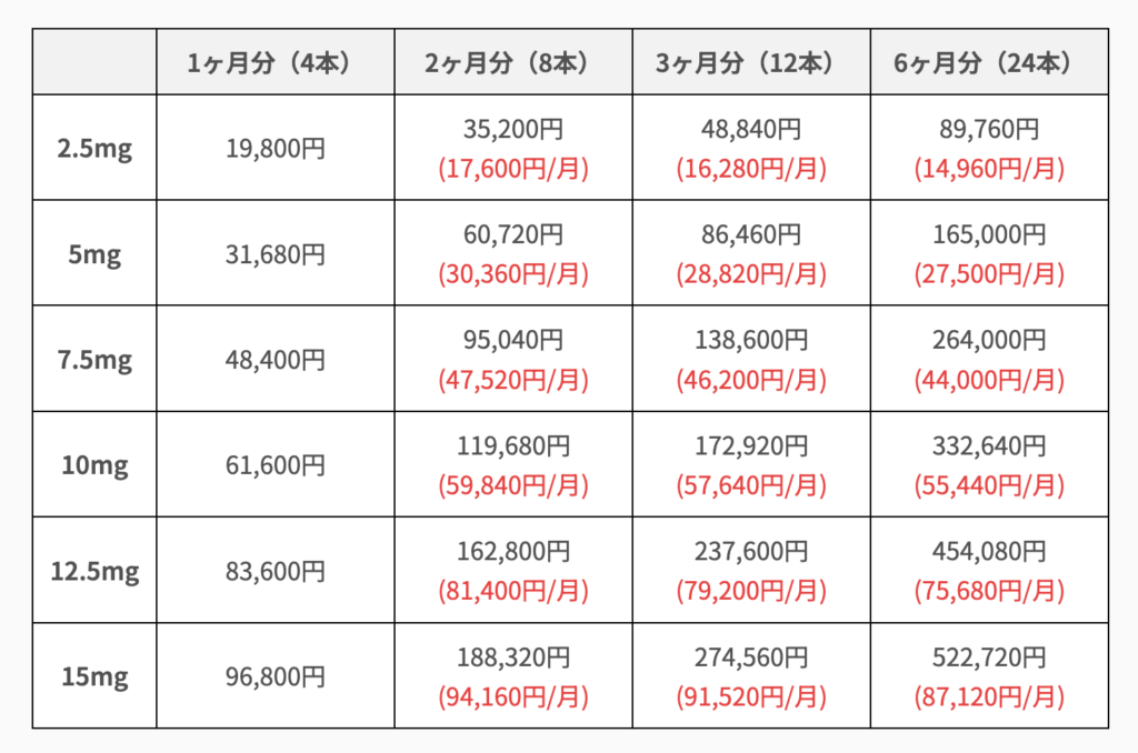 | 2.5mg | 20,000〜30,000円 | 60,000〜90,000円 | 120,000〜180,000円 |