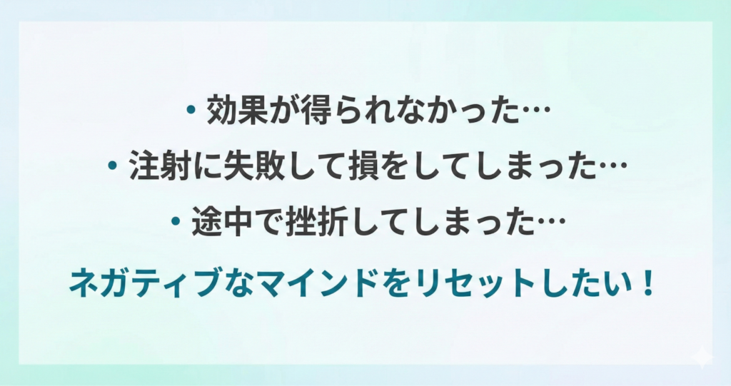 「期待するほど体重が減らなかった」「注射のミスで損をしてしまった」「途中で挫折してしまった」などの経験がある方は、自分は痩せられないと結論づけていませんか?