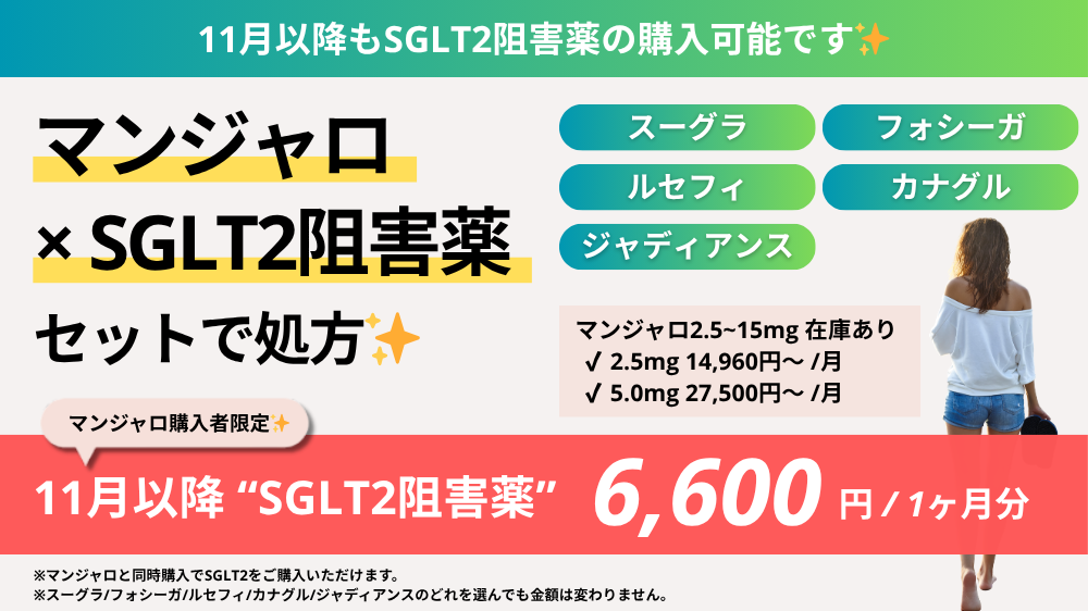 マルベルクリニックでは期間限定でマンジャロをご購入いただいた方に限定で、メディカルダイエットの定番「SGLT2阻害薬」 を1ヶ月分 6,600円でご購入いただけます。