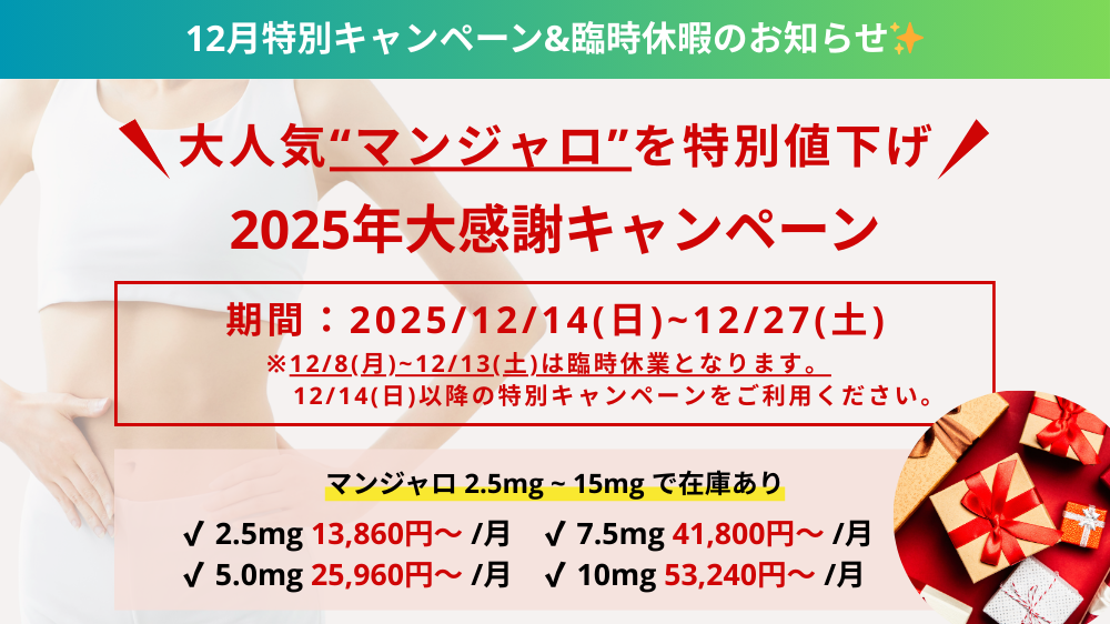 - 休業明けの12月14日(日) からは、お得な「マンジャロ特別値下げキャンペーン」をご利用いただけます✨