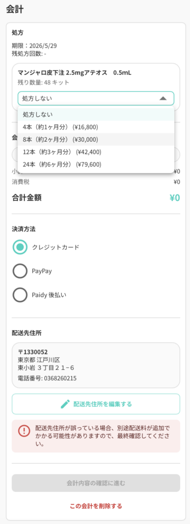 今回受け取りたい薬の量を選択し、決済方法を選択してください。
