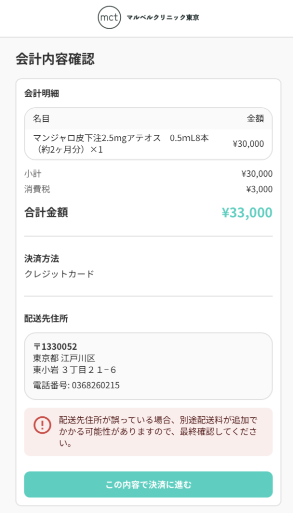 会計内容や配送先住所をご確認の上、「この内容で決済に進む」をクリックし、決済を進めてください。